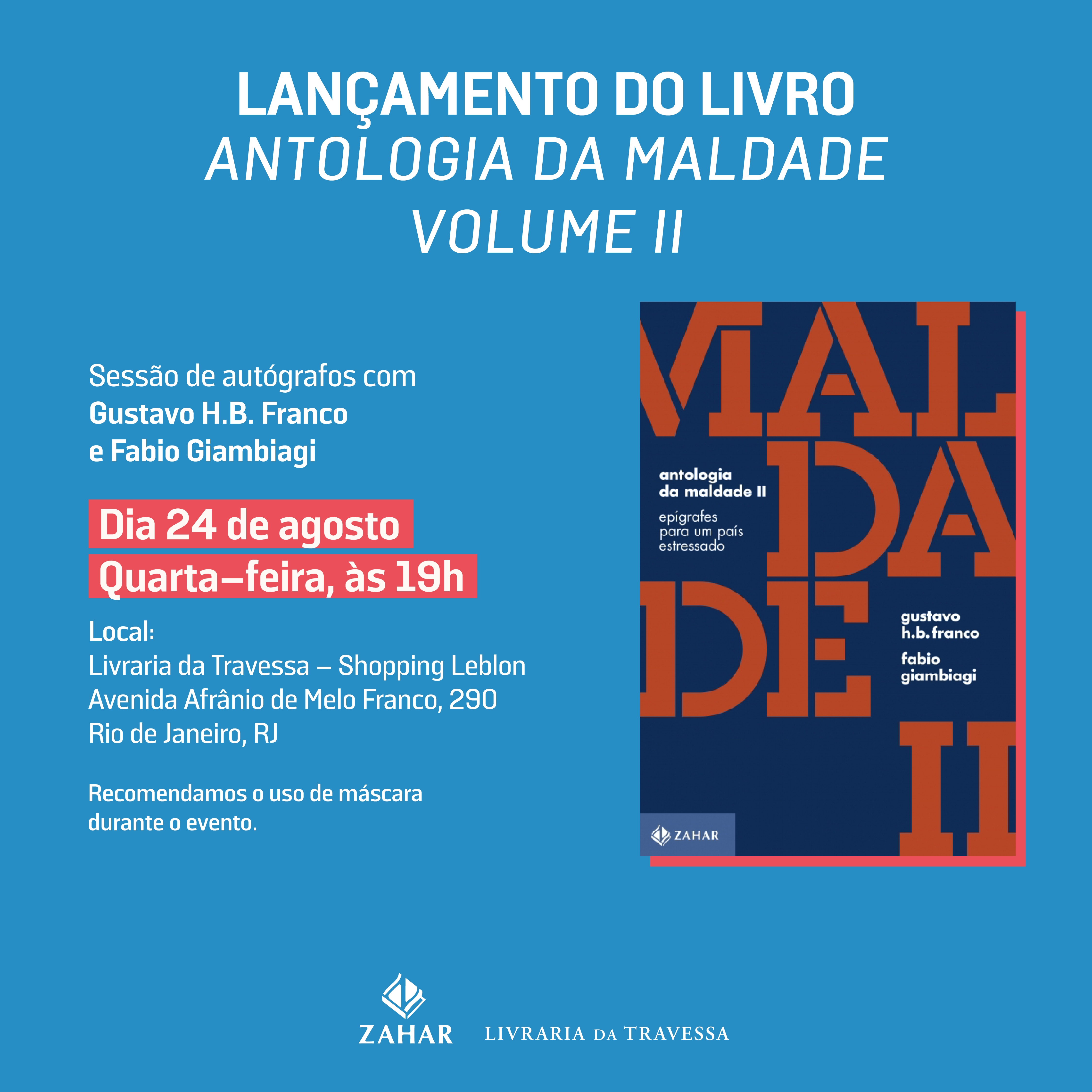 Lançamento do livro Antologia da maldade Volume II: epigrafes para um país estressado por Gustavo H. B. Franco e Fabio Giambiagi. O evento de lançamento ocorrerá no dia 24 de agosto, às 19h, na Livraria da Travessa.
