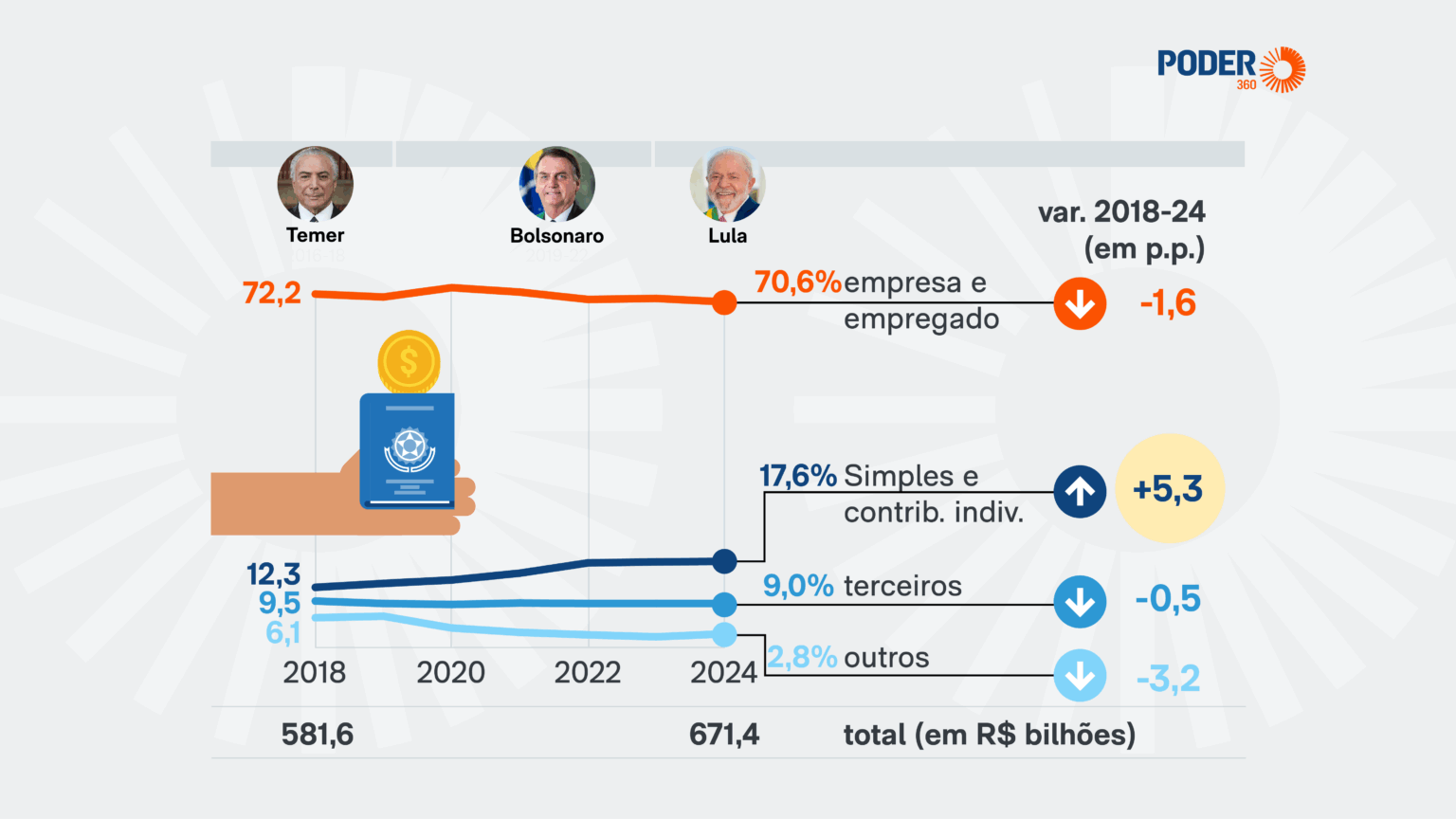 A matéria também traduz essa mudança em termos de PIB. Em 2018, a arrecadação previdenciária foi 5,96% do PIB, com 4,30% vindos de empregados e empresas e 0,73% de empreendedores. Em 2024, os formais ficaram em 4,03% e MEIs e pagadores individuais em 1,01%.