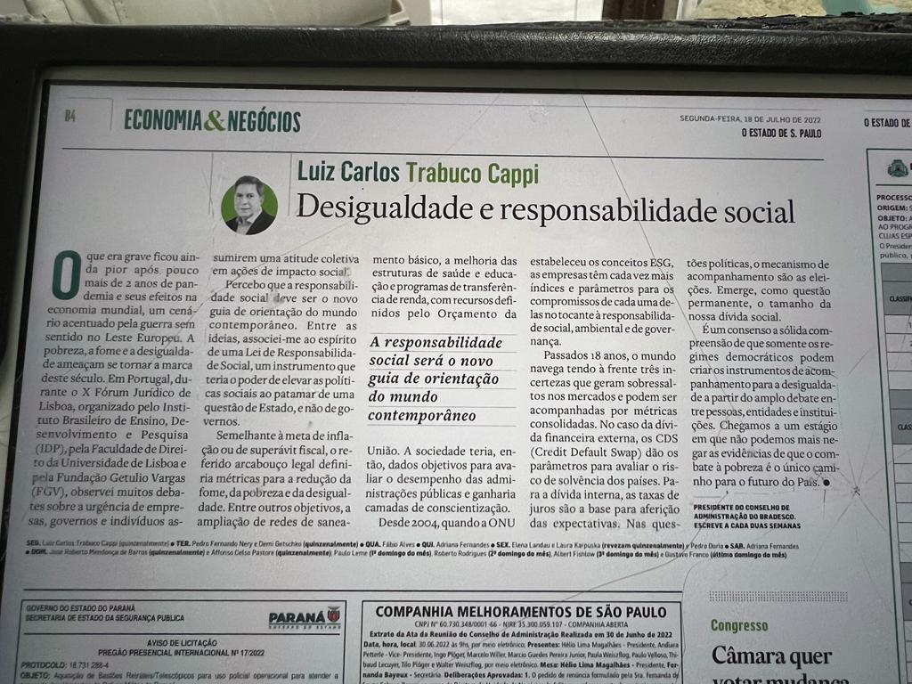 Desigualdade e responsabilidade social por Luiz Carlos Trabuco Cappi publicado por O Estado de S. Paulo (7/2022).