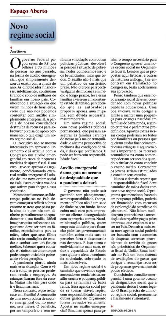 Novo regime social por José Serra publicado por Espaço Aberto (2021).