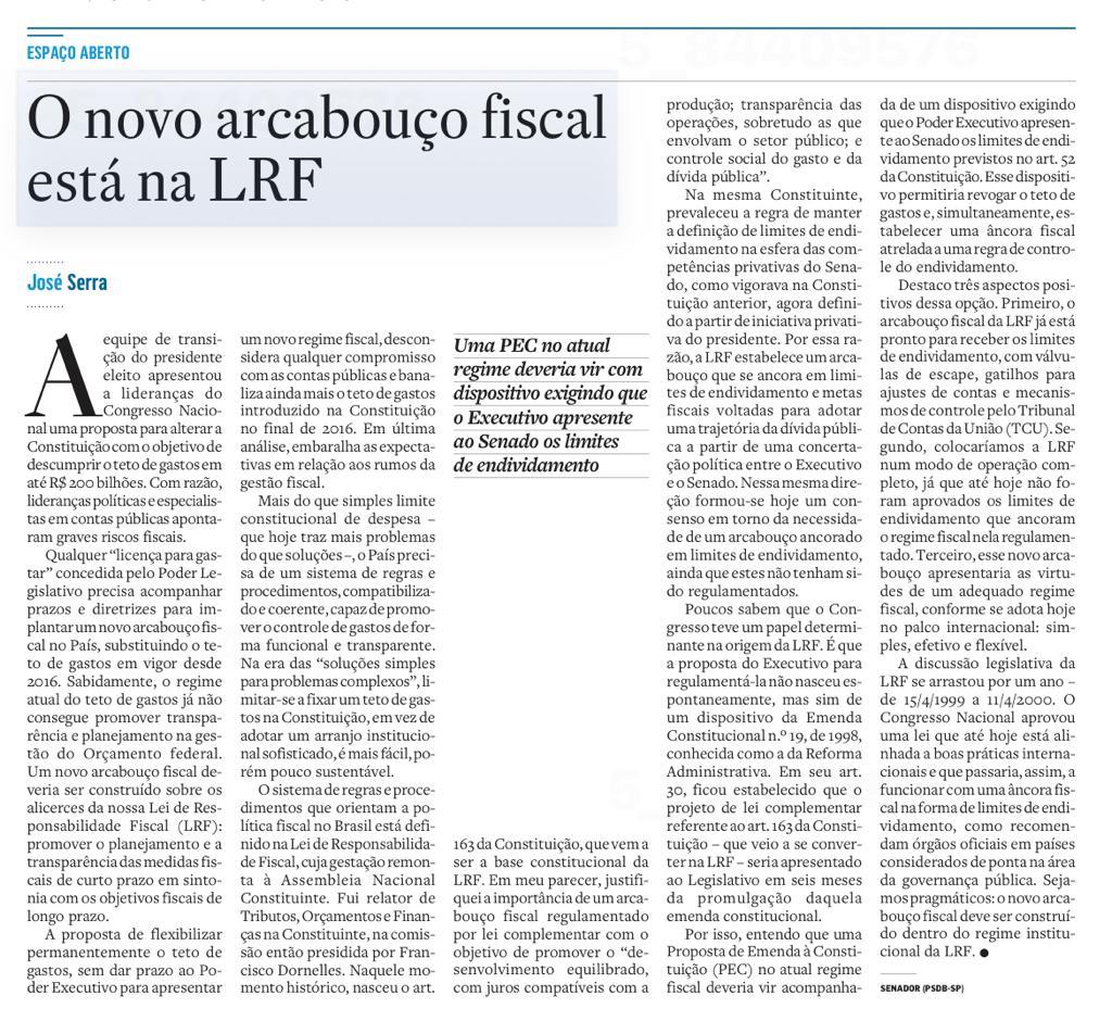 O novo arcabouço fiscal está na LRF por José Serra publicado por Estadão (11/2022).